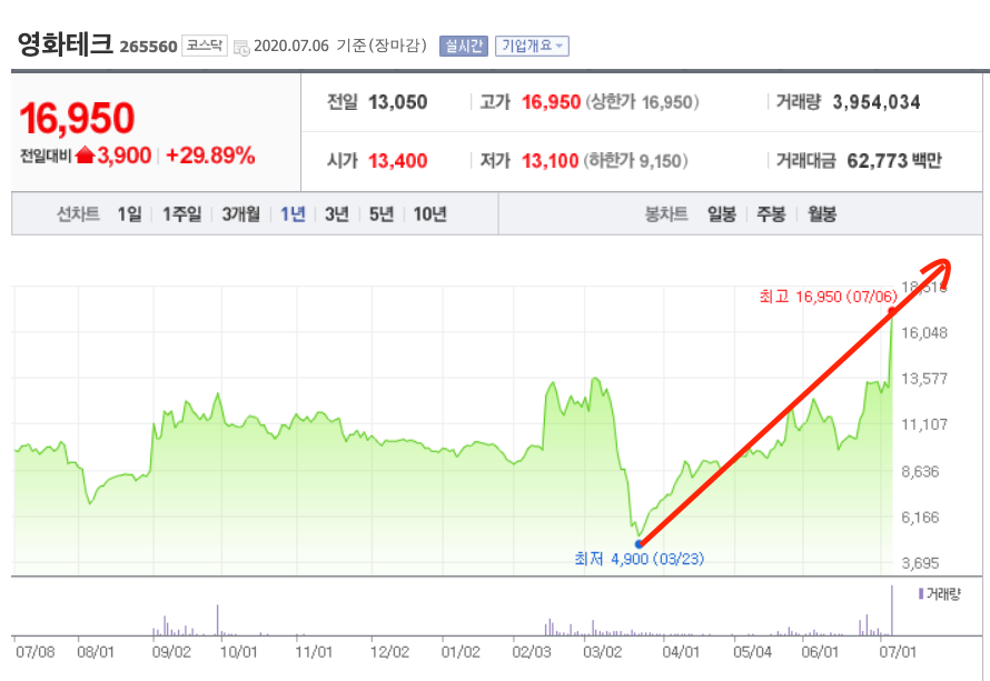 영화테크가 상한가를 기록하며 상승했습니다. 전장대비 3,900원 상승하여 16,950원을 기록했네요. 그래프 먼저 살펴볼까요? 1년 동안의 흐름을 살펴보면 단기적인 시야에서 벗어나기 크게 주식을 살펴볼 수 있습니다.