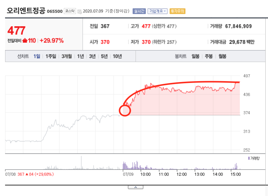 오리엔트정공이 오늘 110원 상승해서 477원을 기록했네요. 작아 보이지만 상승률을 보면 얘기가 달라집니다. 상한가를 기록하여 29.97% 상승을 기록했습니다. 이 동전주는 왜 갑자기 이렇게 상승을 기록했을까요? 상승세의 서막일까요? 아니면 반짝 상승하고 다시 하락하게 될까요? 오리엔트정공이 상승한 이유와 실제 기업은 어떤 기업인지 분석해보겠습니다. 먼저 오늘 하루 어떤 흐름을 보여주었는지 그래프부터 살펴볼까요?