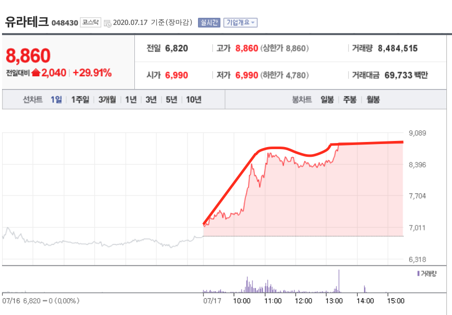 오늘 상한가를 기록한 종목 중 유라테크를 살펴볼까요? 이 종목은 어떤 이유로 이 종목이 상승한 걸까요? 주식을 찬찬히 뜯어봅시다! 먼저 오늘 하루 동안 주가가 어떤 흐름을 보여주었는지 살펴보겠습니다.