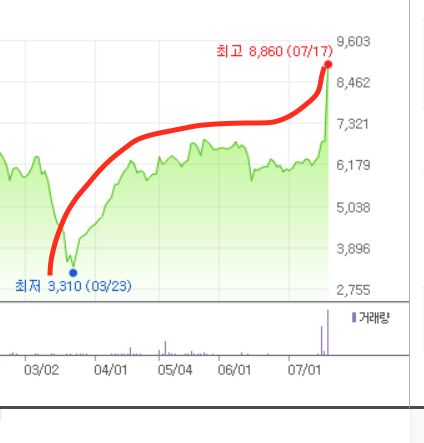 유라테크 주가가 상승하게 된 계기는 현재 꾸준히 시장의 이슈를 선점하고 있는 그린 뉴딜이 한몫을 한 것 같습니다. 유라테크를 비롯한 이 테마에 엮인 여러 주식들이 상한가를 기록했죠. 사실 유라테크의 주식은 지난 2020년 4월 10일 무렵에도 가격에 비해 저평가를 받고 있는 좋은 주식으로 선정되어 코로나 19 사태 이후 일정 부분 상승을 기록해오고 있습니다. 한번 살펴볼까요?