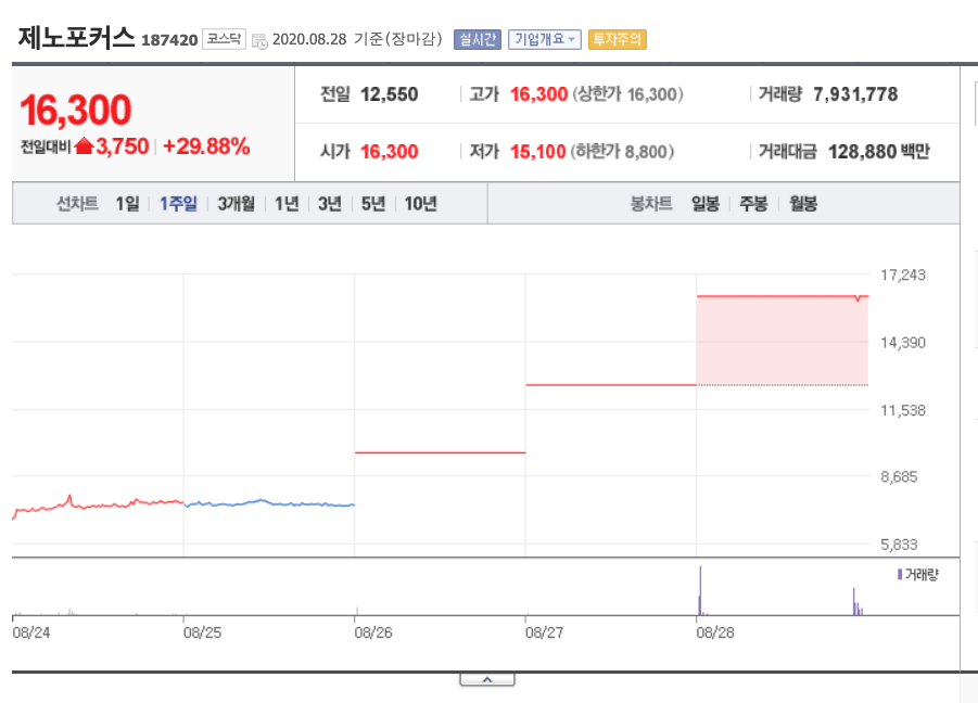 코로나 이슈가 주식시장을 덮은 후 무작정 하락하기만 했던 주식 시장은 코로나 테마주를 형성하며 일정 부분 상성을 주도하고 있습니다. 시간의 흐름에 따라서 코로나라는 거대한 이슈에 시장이 적응을 한 것 같습니다. 제노포커스도 그중 하나인 것 같습니다. 8월 26일 진단키트에 사용되는 필수 효소를 개발했다는 소식에 강세를 보이고 있네요.