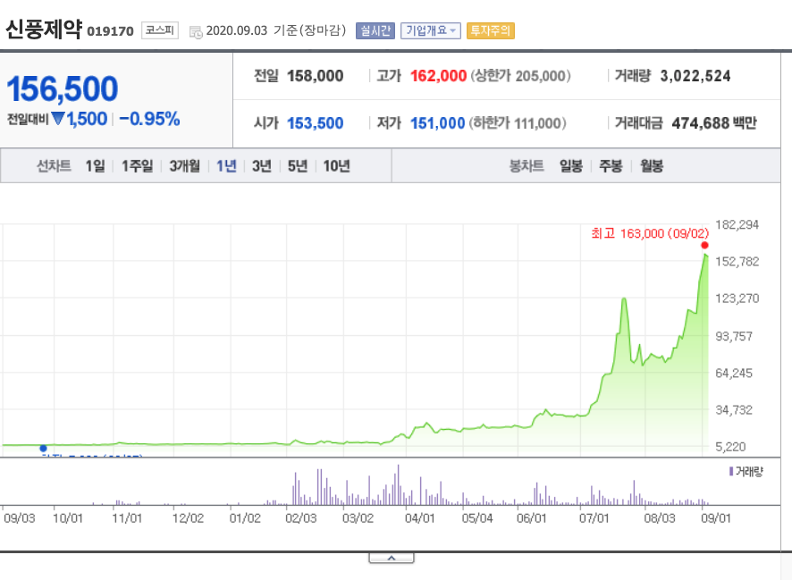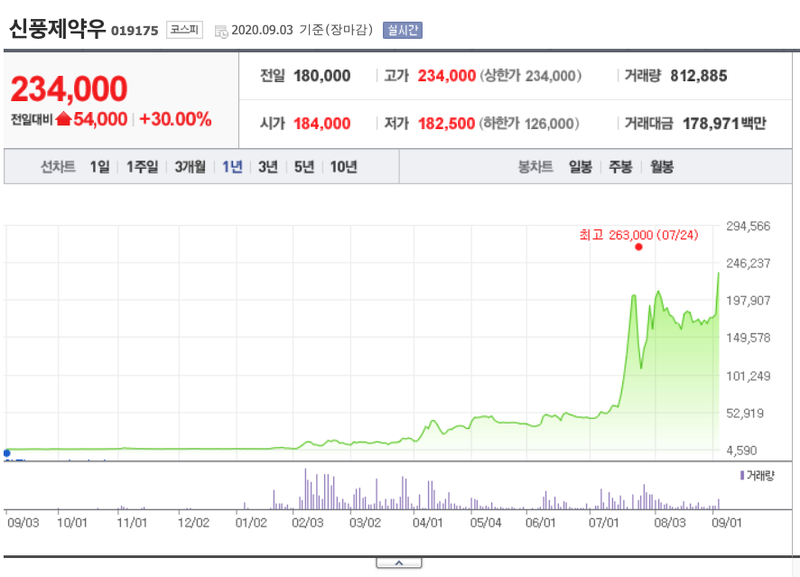신풍제약은 완제의약품 및 원료 의약품 등의 제조 및 판매를 주요 사업으로 영위하고 있는데요. 이 기업이 크게 두각된 이유는 지난 7월 코로나 관련 백신 이슈에 테마주로 엮였기 때문인 것으로 보입니다.