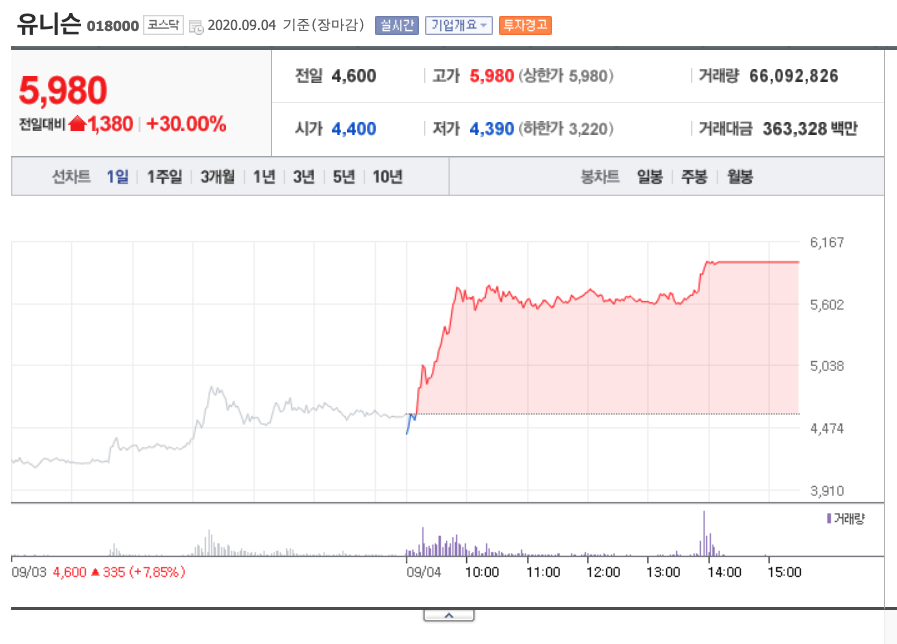 오늘 유니슨은 전장대비 1,380원 상승한 5,980원을 기록했습니다. 유니슨은 오늘 장 시작하면서 잠깐 하락 시작하더니 곧바로 상승세로 전환하였고 곧바로 상한가를 기록했습니다.