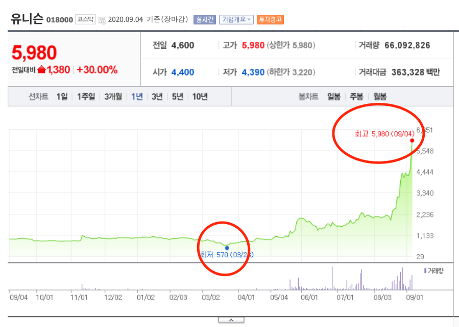 최저가 570원 기록한 이후로 크게 상승하여 10배 이상 상승한 모습을 볼 수 있네요. 위의 1년 치 그래프를 한번 보시면 엄청난 성장을 한 것을 볼 수 있습니다.