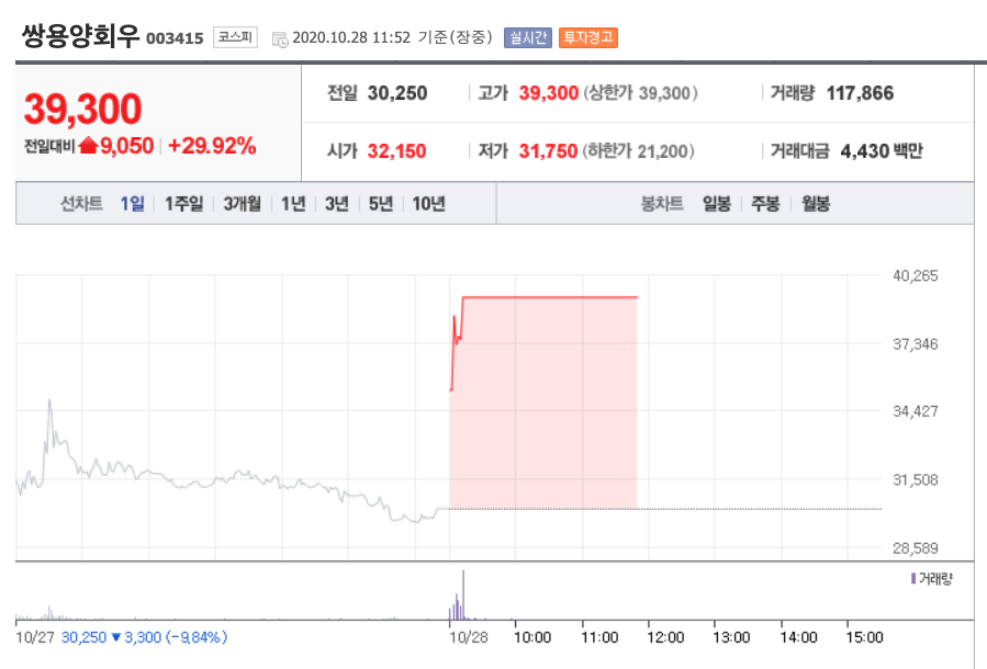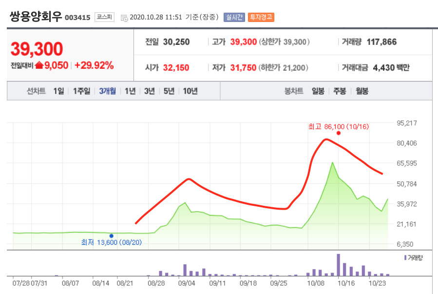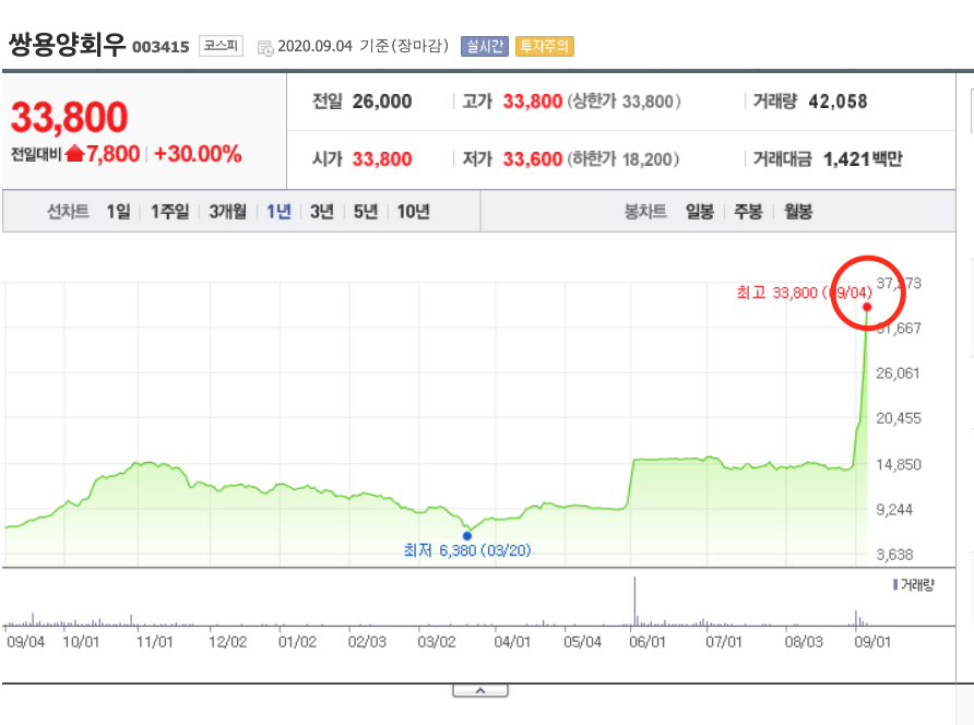 쌍용양회우의 1년간의 그래프 흐름입니다. 지난 6월초 거래량이 폭발하면서 한 단계 점프한 주식은 현재 33,800원으로 폭등한 상태입니다. 현재 상황은 무려 80,000원대까지 폭등했다가 급격한 하락 중입니다. 오늘의 상승은 말하자면 설거지 상승으로 봐야 할 겁니다.