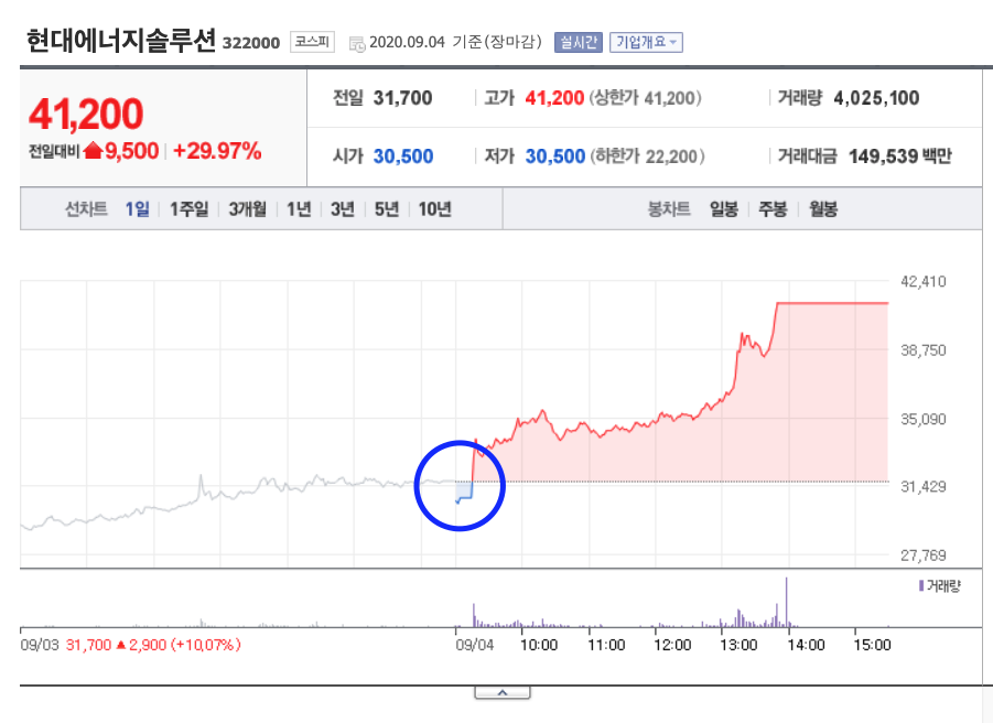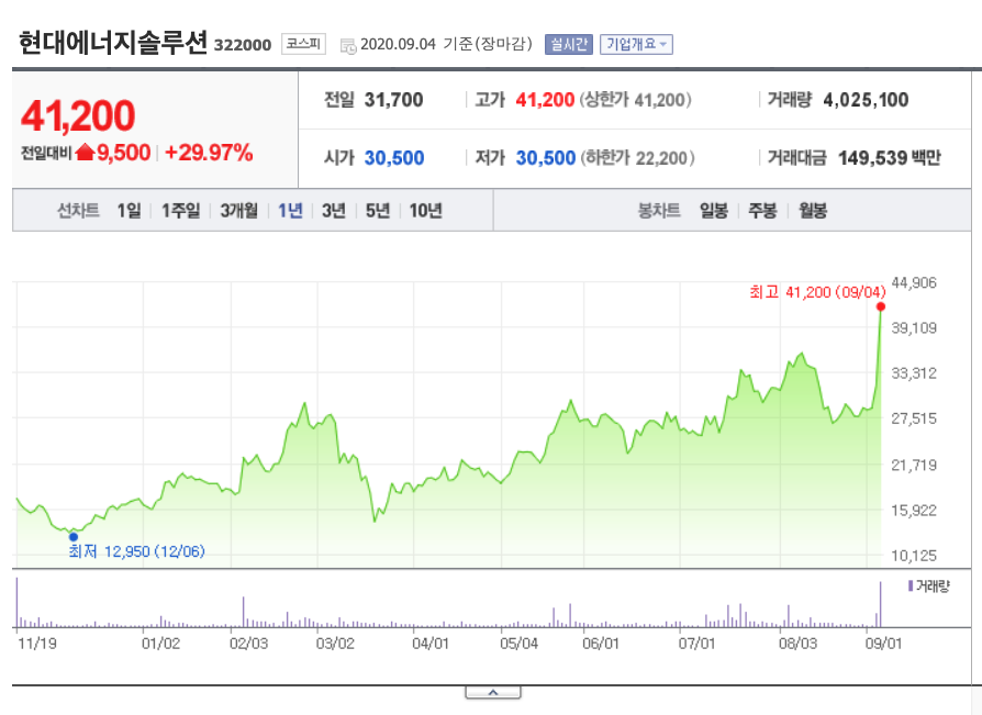 그런 의미에서 현대에너지솔루션은 충분히 상승할 가능성이 있는 종목입니다. 현재가를 살펴보면 이미 많이 상승한 모습을 보여주었지만, 지난 금요일(2020.09.04) 또 한 번 상한가를 기록했습니다. 전장대비 9,500원 상승한 41,200원을 기록했네요. 놀라운 상승을 보여주었습니다.