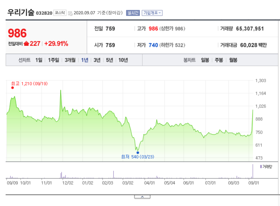 오늘의 상승세를 견인한 코스닥 종목 하나를 소개합니다. 우리 기술인데요. 아주 적은 규모의 주식입니다. 전일대비 227원 상승한 986원을 기록했습니다. 시가총액 1034억 원으로 시가총액 순위 702위입니다.