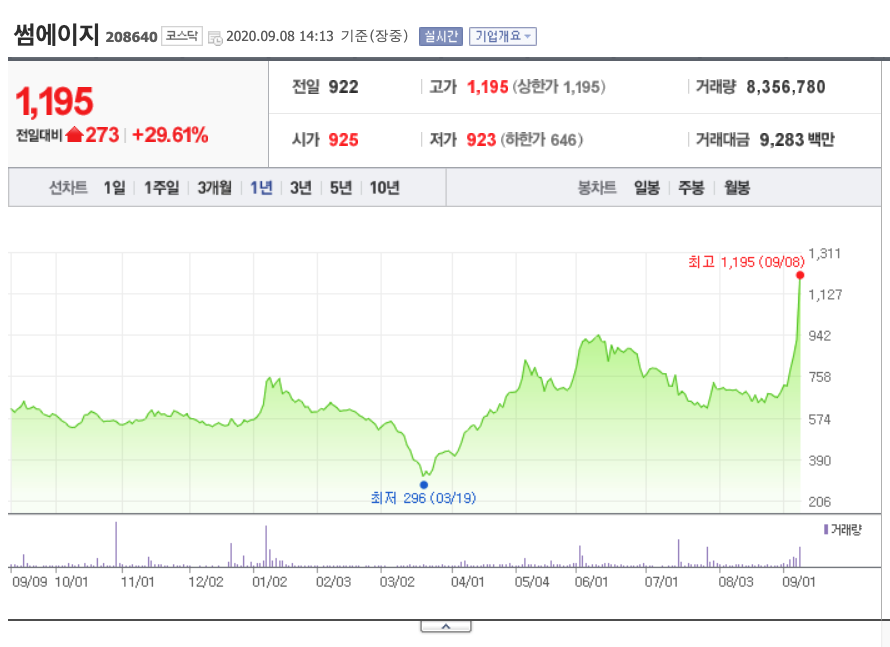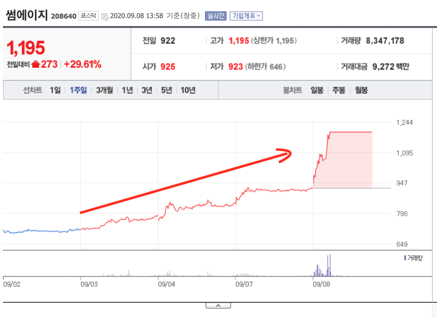 썸에이지 주가는 9월 2일 횡보를 기록한 이후로 조금씩 상승하는 모습을 보여주다가 오늘 거래량이 폭발하면서 장 초반 상한가를 기록했습니다. 어떤 호재가 작동하여 상한가를 기록했을까요?