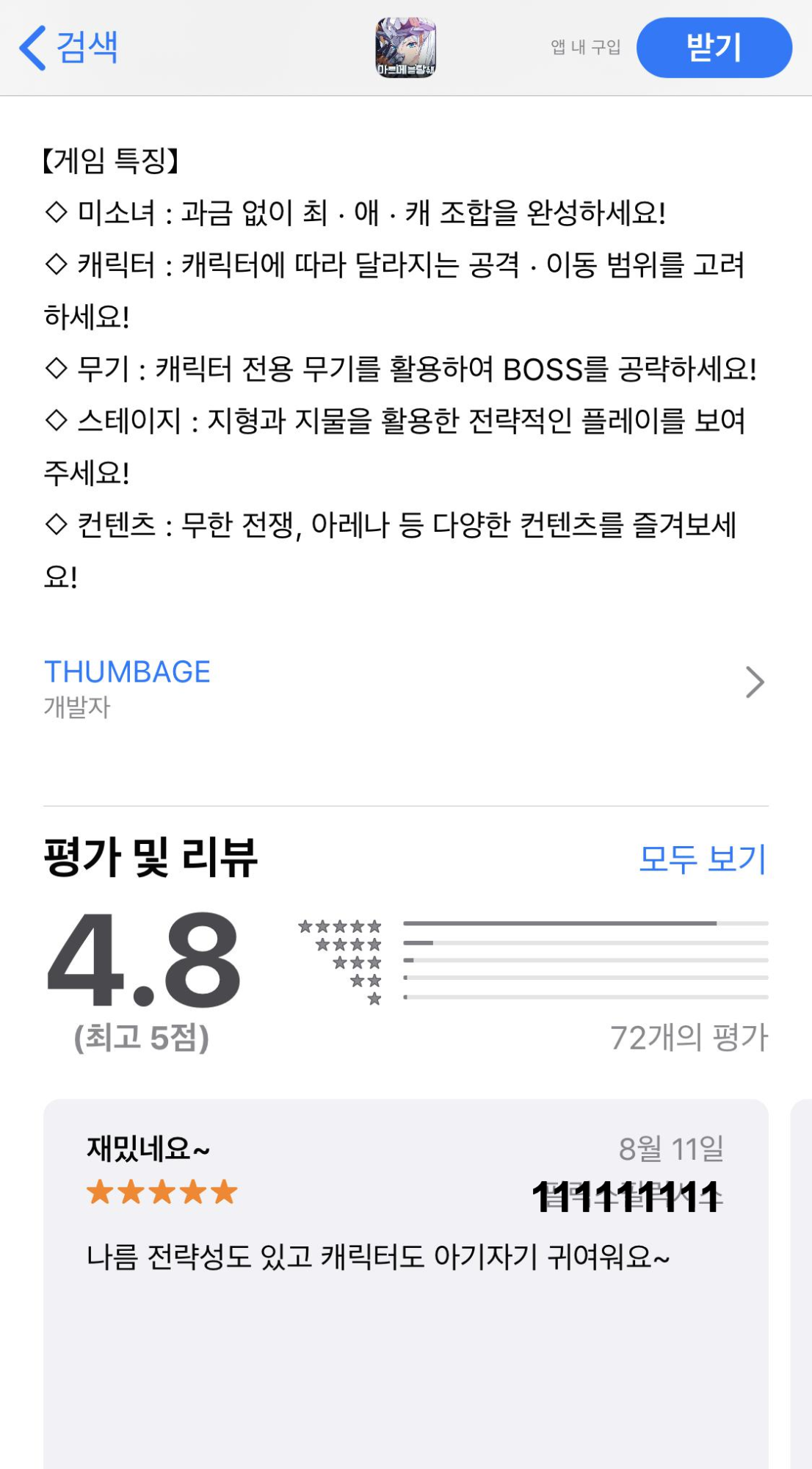아르메 블랑쉐는 미소년 백병전을 지향하는 게임으로 현재 앱스토어 평점 4.8을 기록하고 있습니다.