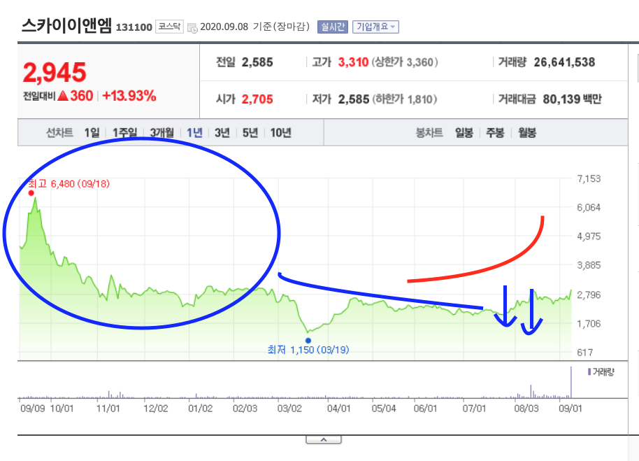 스카이이앤엠은 오전 상승 횡보를 유지하다가 초록뱀이 스카이이앤엠의 대주주로 등극한 소식에 힘입어 큰 폭의 상승을 보여주었지만, 유지하지 못하고 조금 하락하고 말았습니다. 1년 그래프를 살펴보면 그 이유를 조금 쉽게 파악할 수 있을 것 같은데요.