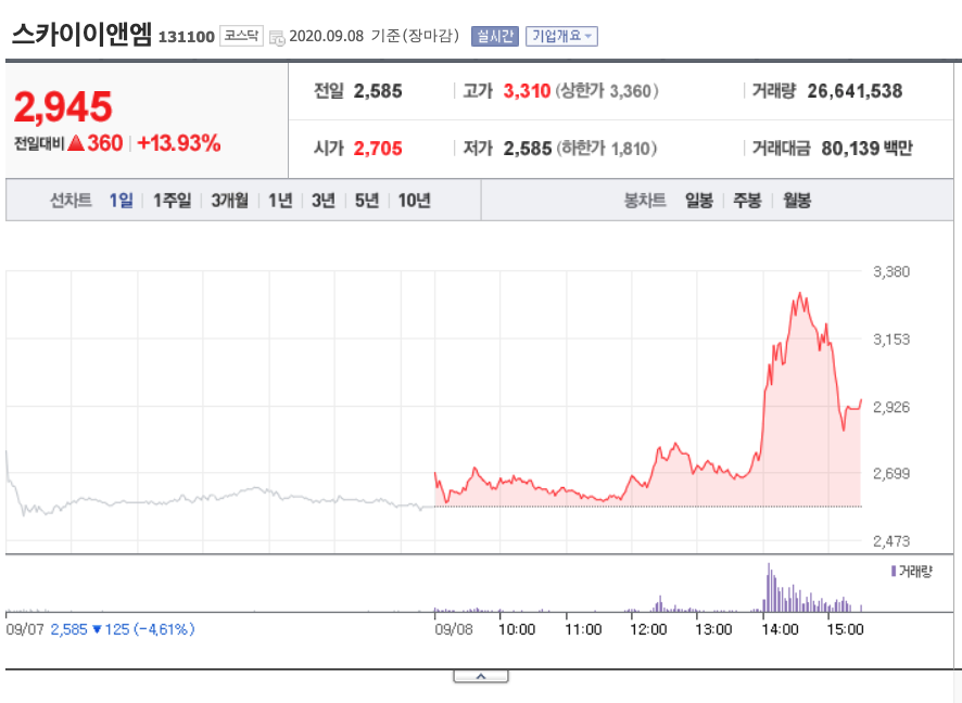 초록뱀과 함께 스카이이앤엠 역시 금일 큰 폭으로 상승하며 상승을 견인했습니다. 다만 오후 들어 상승 모멘텀을 유지하지 못하고 일부 하락세를 보여주었네요.