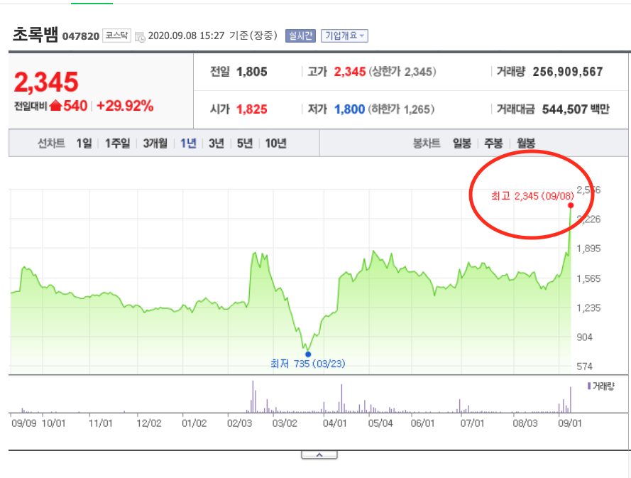 초록뱀은 코스닥 상장기업으로 금일 전장대비 540원 상승한 2,345원을 기록했습니다. 52주 최고가를 기록했으니 더욱 상승할 만한 여지가 있어 보입니다. 물려있는 사람들이 그만큼 적으므로 꾸준히 상승할 가능성도 있습니다.