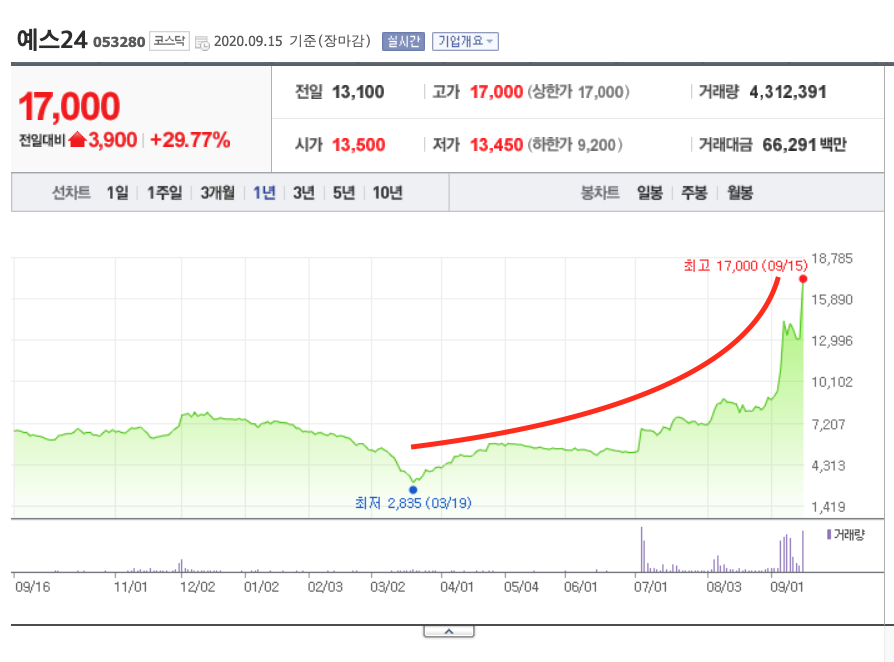 카카오나, 넷마블처럼 규모가 큰 회사가 아니므로 적은 돈이 몰리자 이처럼 큰 상승폭을 기록한 것으로 보입니다.