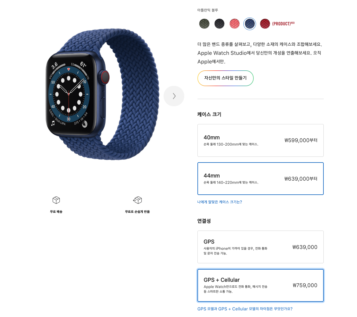 44m 기준으로 gps 모델 639,000원 / 셀룰러 모델 759,000원입니다.