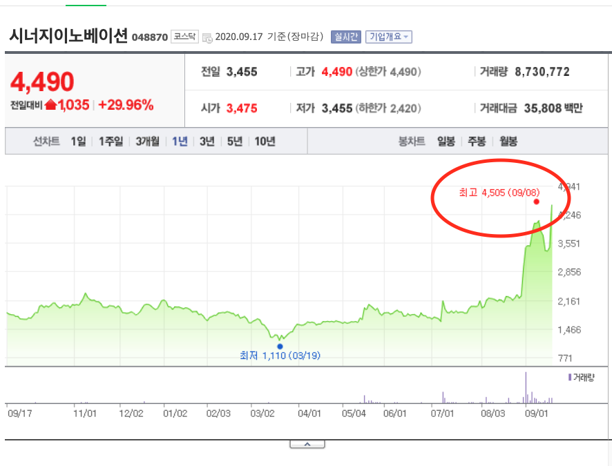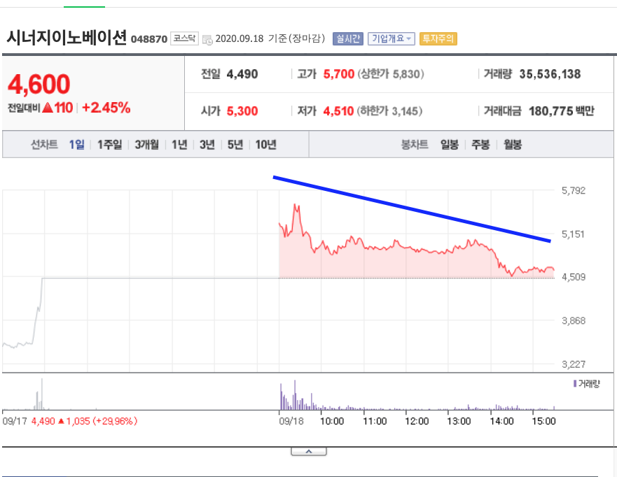알아볼 회사 역시 진단키트 관련해서 상승을 기록한 회사입니다. 하락장 속에서도 상한가를 기록한 시너지이노베이션입니다. 먼저 그래프 살펴보시겠습니다. 목요일 상한가를 기록하여 다음날인 금요일에 어떤 흐름을 보여줄지 기대가 되는 종목이었는데요. 조금 아쉬운 모습을 보여주었네요.