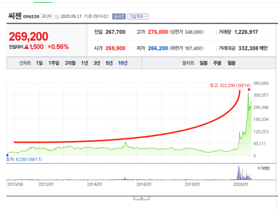 우리나라의 코로나 관련 이슈에서 가장 큰 상승폭을 보여준 종목들은 무엇일까요? 바로 다름아닌 진단키트입니다. 코로나19 진단 키트를 만들었던 씨젠은 그야말로 코로나 이슈 속에서 가장 큰 상승을 한 기업이라고 할 수 있을 것 같습니다. 10년동안의 씨젠의 주가 흐름을 보면 정말 엄청난 성장을 했다고 말 할 수 있을텐데요. 오랜기간 동안 60,000원의 벽을 넘지 못하고 횡보했던 주식은 코로나 이후 엄청난 성장을 기록합니다. 그래프로 한번 보실까요?