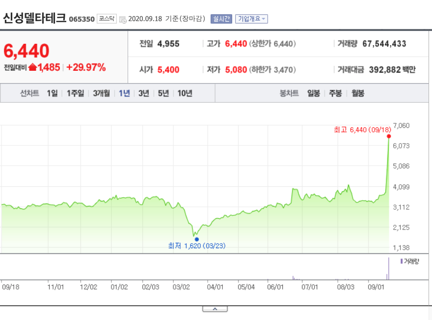 이 소식에 힘입어 코스닥 상장기업 신성델타 테크가 전장대비 1,485원 상승한 6,440원을 기록했습니다. 회사는 52주 최고가를 가볍게 갱신했네요. 4,955원이 52주 최고가였습니다. 시가총액은 1637억 원, 시가총액 순위는 코스닥 481위입니다. 상승하기 좋은 주식 규모이고, 52주 최고가를 갱신한 만큼 더 크게 상승할 가능성도 충분해 보입니다. 꾸준히 지켜봐야 할 것 같습니다.