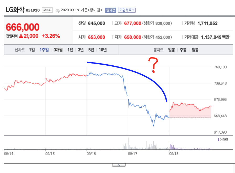 신성델타 테크는 기업 개요에서 살펴보았듯이 여러 가지 부품 사업을 영위하고 있습니다. 이 회사의 가장 큰 주 거래 회사가 엘지화학인데요. 그래서인지 엘지화학 이슈에 함께 상승한 것으로 보입니다. 신성델타 테크에 대해 알아보기 전에 엘지 화학에 대해서 먼저 살펴봐야 할 것 같습니다. lg화학은 오늘 전장대비 21,000원 상승한 666,000원을 기록하였지만, 분사 관련 이슈로 인해 이번 주 내내 급락세를 보여왔습니다.