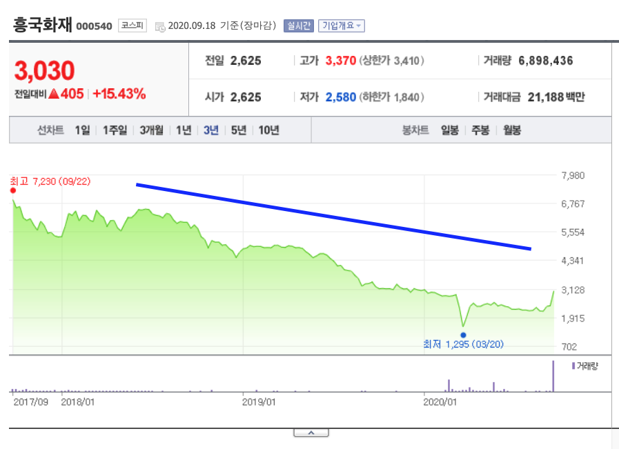 먼저 그럼 흥국화재의 3년간의 주가 흐름을 살펴보는 것으로 시작해보겠습니다.