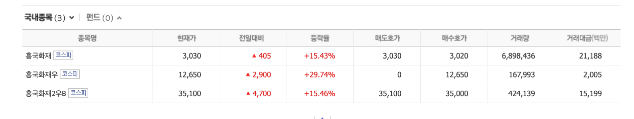 지난 금요일에 상한가를 기록한 흥국화재 우의 경우가 그런 경우라고 할 수 있을 것 같습니다.