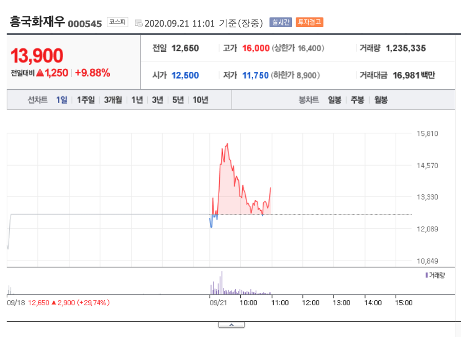월요일 장이 열리고 흥국화재 우 주식은 오전 다시 한번 뛰어오르는 모습을 보여주었는데요. 현재는 상승분을 모두 반납한 상태이지만, 오후 들어서 다시 한번 좋은 모습을 보여줄지 기대가 됩니다.