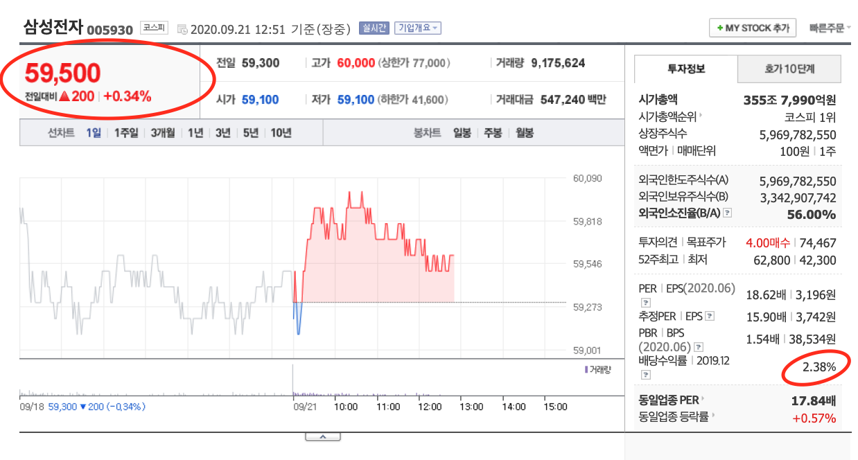 삼성전자 주식의 경우 현재 시가는 59,500원입니다.