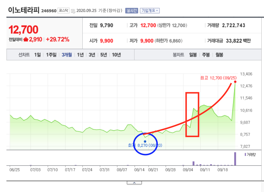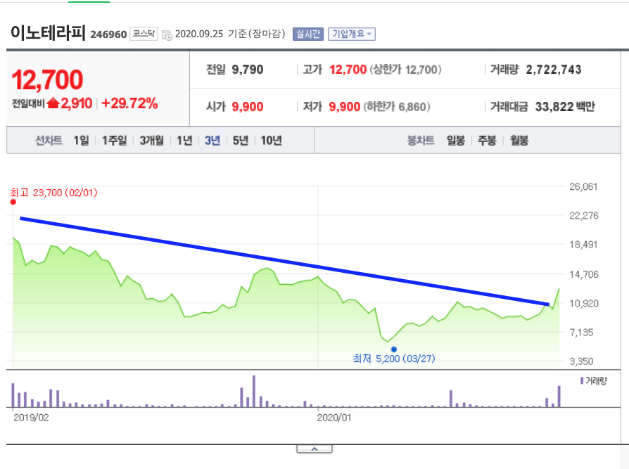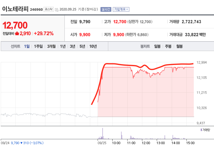 살펴볼 종목은 이노테라피입니다. 이노테라피는 2020년 9월25일 전장대비 2,910원 상승한 12,700원을 기록했습니다.