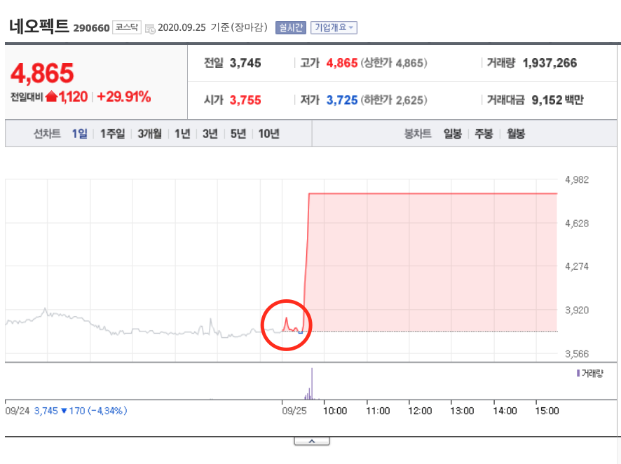 네오펙트는 지난 금요일 9월25일 상한가를 기록하며 장을 마쳤습니다.