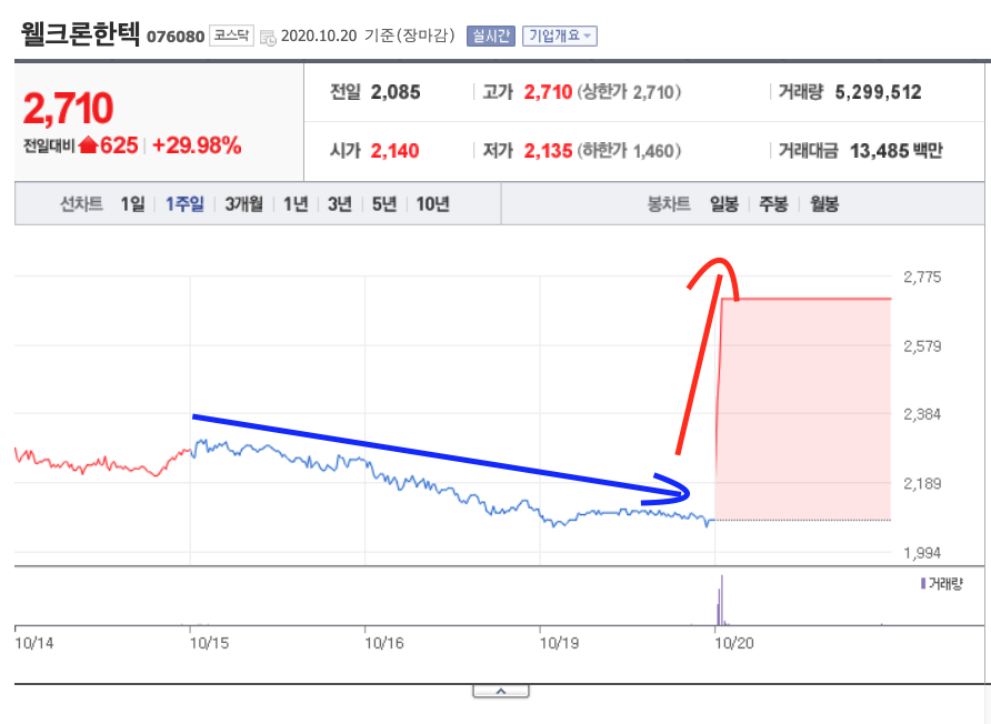 웰크론한텍은 전장대비 10배 이상의 거래량이 폭발하며 625원 상승한 2,710원을 기록했습니다. 물론 아직 52주 최고가인 3,540원을 넘지는 못했지만 테마나, 관련 이슈가 아닌 회사 자체에 대한 강점이 있는 상황이므로 좀 더 지켜봐도 괜찮을 것 같습니다.