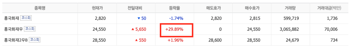 흥국화재우 카카오? 아슬아슬한 상한가 유지