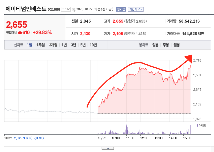 에이티넘인베스트의 주가는 아침부터 갭상승으로 시작했습니다. 비트코인의 페이팔 진출 소식에 곧바로 투자자들이 몰려들었고 상승세를 만들어 냈습니다. 거래량 역시 엄청나게 뛰었습니다. 전장대비 30배 넘게 폭등했습니다. 거래량이 늘어나는 것은 기본적으로 이슈가 만들어 지고 있는 신호기 때문에 주식 상승에 좋은 영향을 미칠 수 있습니다. 단 상승하는 경우에 한해서요.