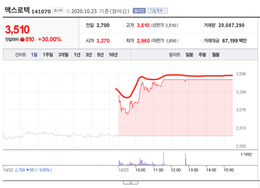 거래량이 평상시에 비해 거의 15배 정도 증가했습니다. 맥스로텍의 경우 거래량이 몰렸을때 대부분 상승하는 모습을 보여주었네요. 좋은 추세로 보입니다.