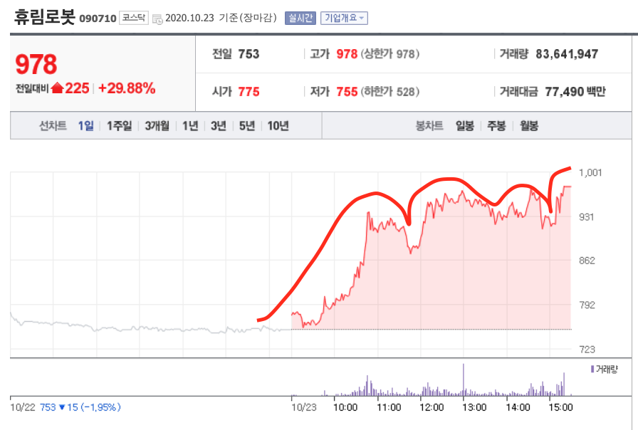 읽어주셔서 감사합니다. 보시는 분의 시간을 낭비하는 정보가 아니라 읽을만한 글을 쓰기 위해 노력하겠습니다. 휴림 로봇이 지난 금요일 10월 24일 상한가로 장을 마감했습니다. 로봇이라는 단어는 충분히 미래지향적으로 보입니다. 하지만 이 종목이 상한가를 기록한 이유는 다른 곳에 있습니다. 주가 자체가 상승할만한 종목인가, 아니면 테마 이후에 꺼질 종목인가, 분석해보겠습니다. 먼저 그래프부터 살펴보실게요.