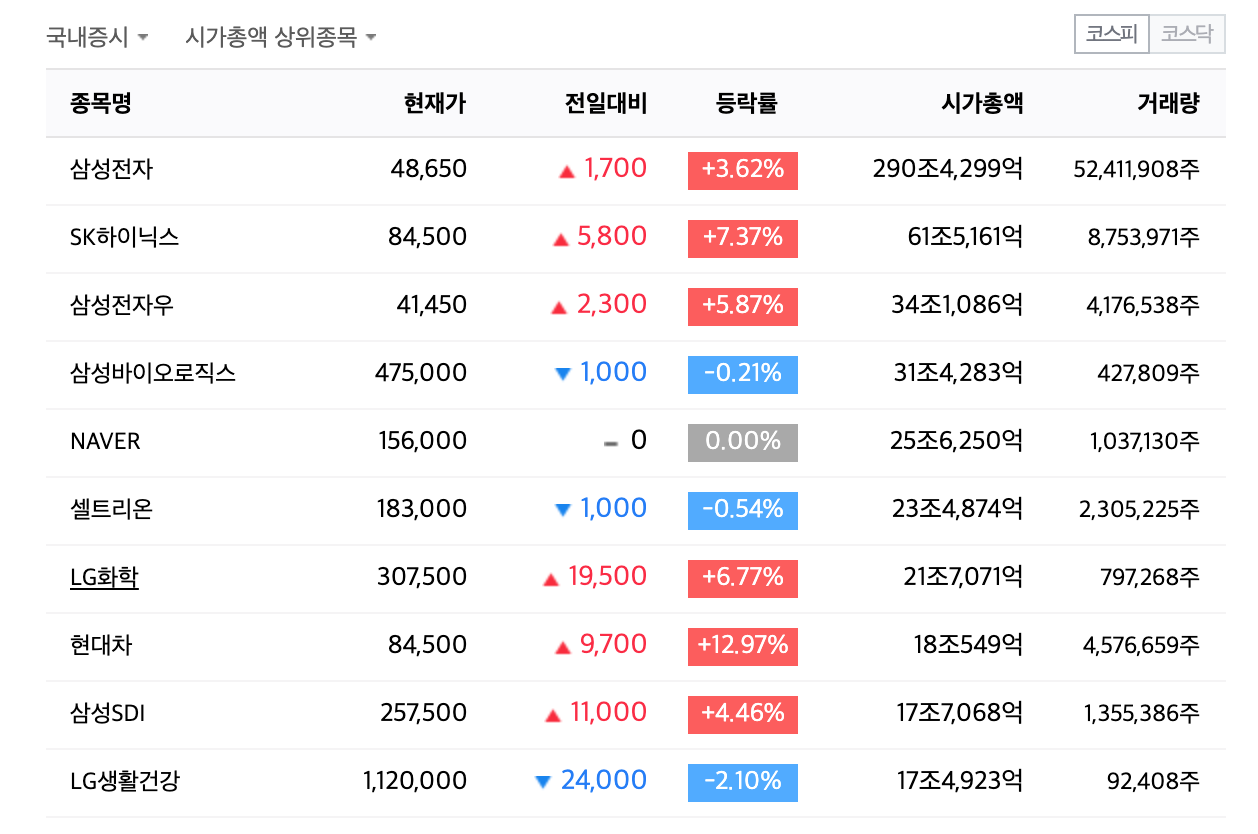시가총액 상위종목을 바탕으로