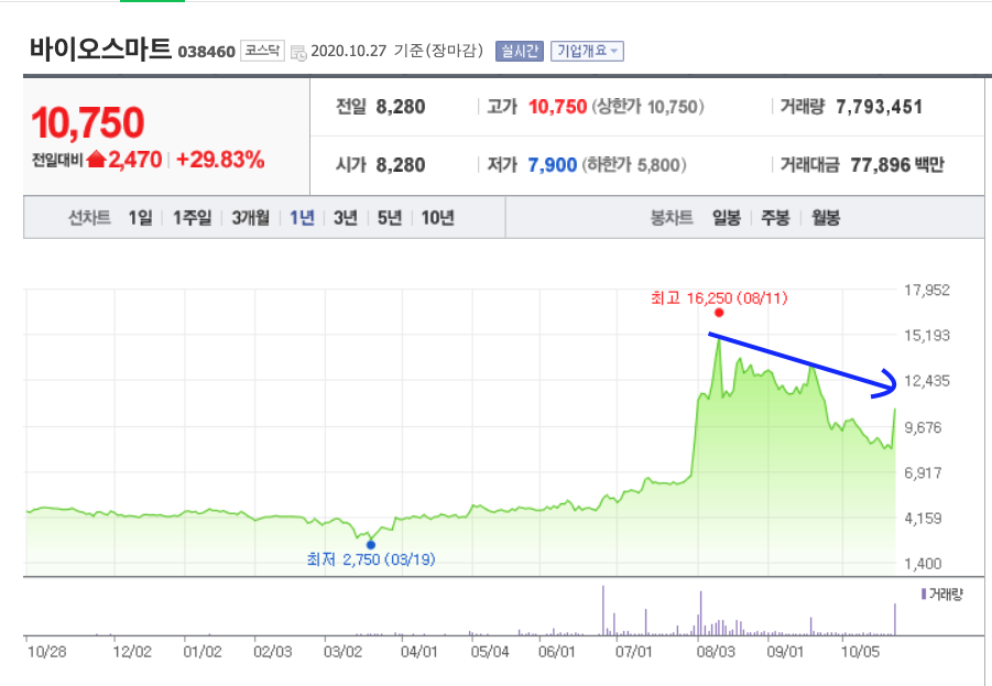 바이오스마트의 호재는 코로나19 진단키트와 연관이 되어있습니다. 모든 주가가 초토화되던 시기인 암흑 3월을 버티고 코로나 19 관련된 주식들의 옥석이 가려지던 지난 8월 한차레 상승 모멘텀을 겪었습니다. 하지만 어떤 이유인지 모르겠지만 쭉 흘러내리고 있는 양상을 보여주고 있습니다.