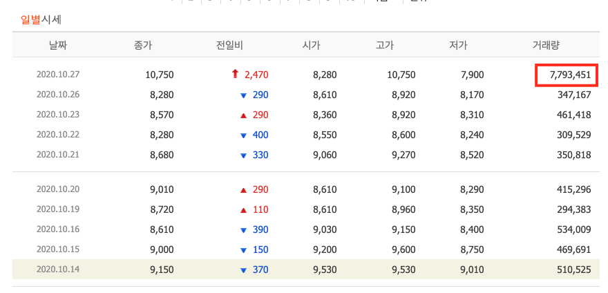거래량 역시 호재 소식과 맞물려 큰폭의 증가세를 보였습니다.