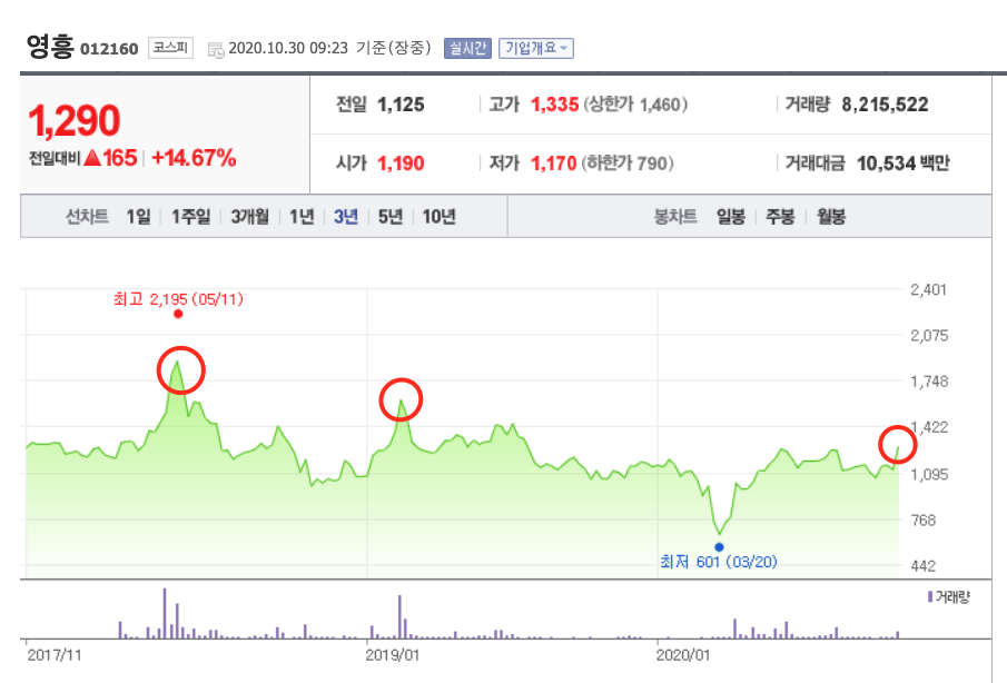 영흥의 주가를 살펴보면 변동성이 상당하다는 걸 알 수 있습니다. 2017년 5월 무렵 최고가인 2,195원을 기록한 뒤 수차례 변동성을 보이며 하락해 오고 있는 추세입니다. 한차례 더 위로 슈팅할 수 있을까요?