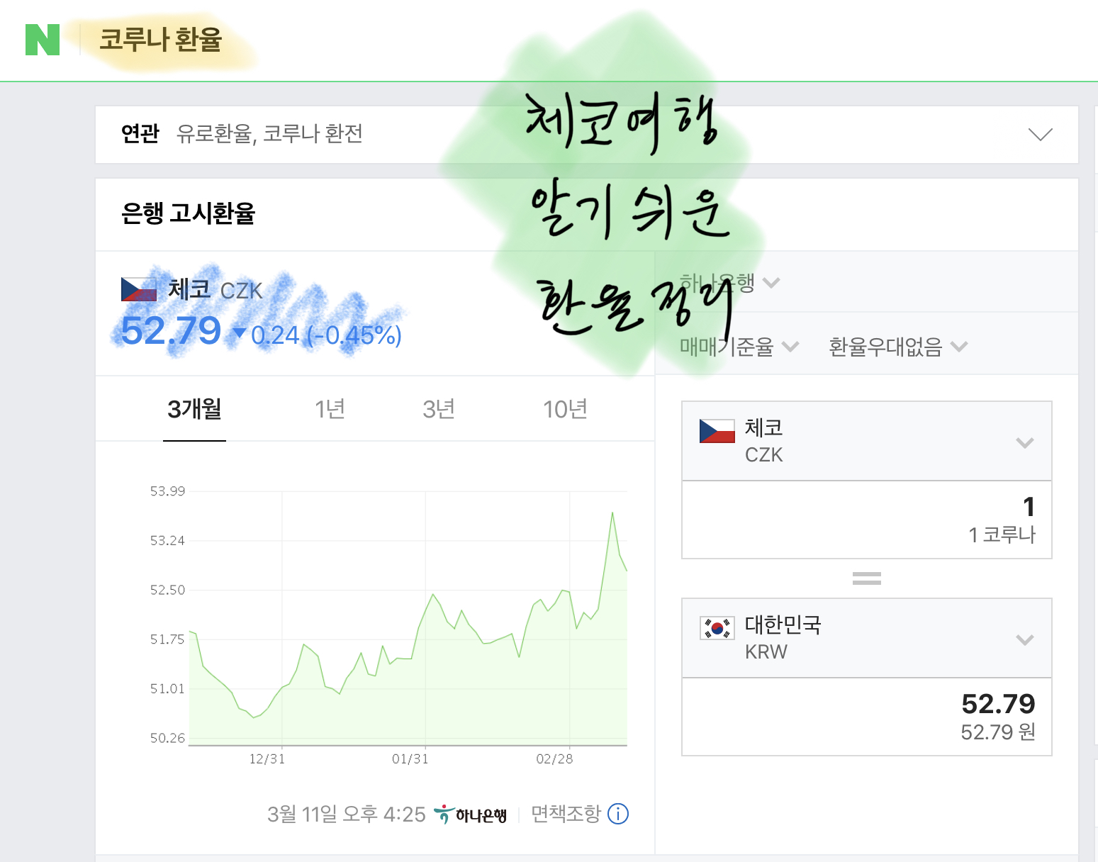 한국 돈 53.68원 - 1코루나(CZK) 2020년 3월 9일 기준 하나은행