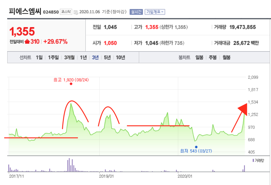 피에스엠씨의 주가가 상한가를 기록했습니다. 특히 피에스엠씨의 경우 경영권에 대한 치열한 공방이 이어졌는데요. 3년간의 주가를 살펴보면 이 치열한 싸움의 흔적이 남아있습니다. 한번 살펴볼까요?