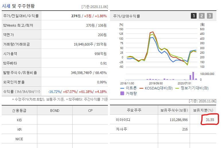 왜 이트론이 상한가를 기록한 것이 아니라 이아이디가 상한가를 기록한 걸까요? 아무래도 실제 소유주라는 것이 투자자들에게 더 크게 다가왔던 게 아닌가 싶습니다. 이트론 역시 10%넘게 상승한 상황입니다. 지분 구조상 이트론의 주요 주주가 이아이디라고 많은 투자자들이 판단한 것으로 보이네요.