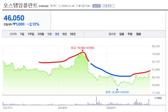 최근 거래량추이를 살펴보면 조금씩 오스템임플란트에 대한 관심이 떨어져 있는 것을 확인할 수 있습니다. 다만, 추후 이슈에 대응하여 상승할만한 주식이라고 판단한다면, 투자 적기는 바로 지금이 아닐까 싶네요.