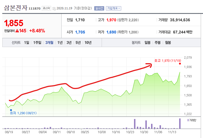 주식의 주요주주인 삼본 전자 주식도 일정 부분 상승한 것을 볼 수 있었습니다. 이 주식도 함께 눈여겨봐도 좋을 것 같습니다. 3개월 동안 꾸준한 상승세를 보여주었습니다. 비록 11월 19일 상한가를 기록하지는 못했습니다만, 지켜보면 좋을 종목으로 보입니다. 삼본전자 주가와 필룩스 주가 잘 살펴보십시요.