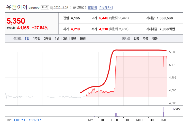11월24일 내내 상한가를 기록했지만, 장 마칠때 쯤 안타갑게 조금 흘러내리고 말았습니다. 이에 따라 거래량도 크게 늘어났는데요.