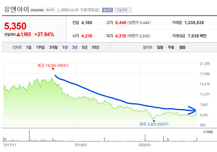 유앤아이 주가의 3년 흐름을 살펴보면 조금 안타 갑네요. 최고가를 기록했던 2018년의 기록 이후 꾸준히 흘러내리고 있는 모습입니다.