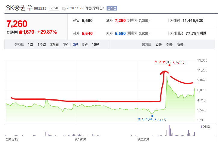 한동안 우리나라의 주가 흐름과 반대로 갈 가능성도 있습니다. SK증권우는 횡보를 기록하다가 시장 흐름이 변하거나, 안정적인 자본이 필요한 순간에 상승세를 유지하는 금융주의 특성을 그대로 가지고 있습니다.