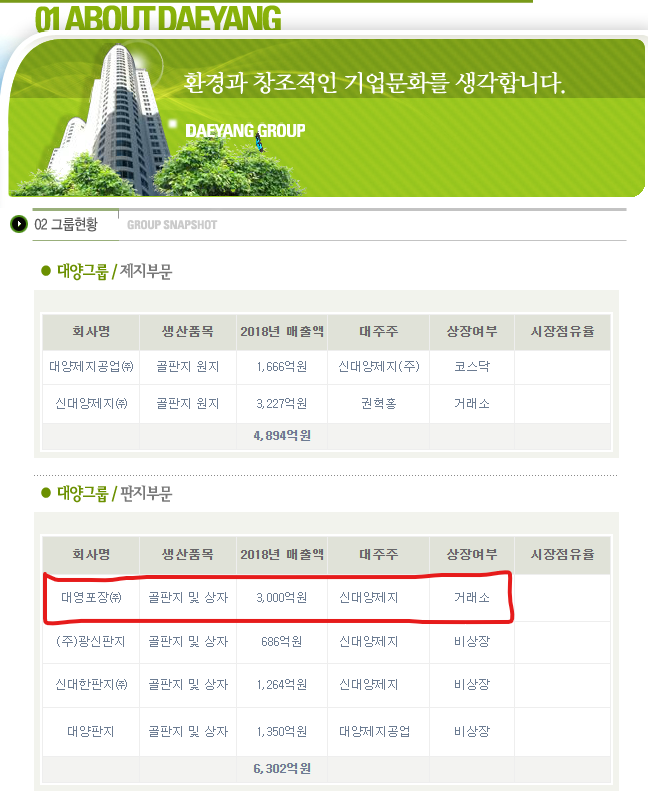 대영포장은 1979년 6월1일에 설립되어 1990년 3월 6일로 유가증권시장에 상장되어 매매가 시작되었습니다. 대영포장은 설립이래 골판지 및 골판지 상자를 제조, 판매하고 있으며 7개의 계열회사가 존재합니다.
