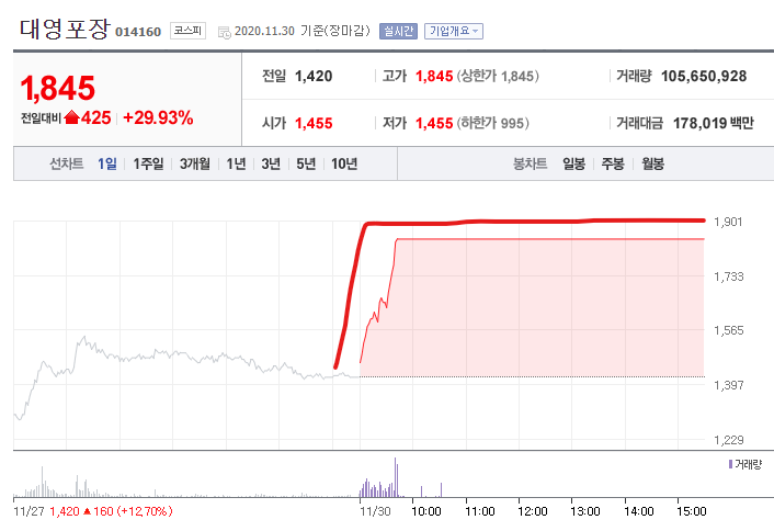 페이퍼코리아, 등등의 제지 회사들의 상승할대에도 상승폭이 크지 않았던 것으로 보이는데요. 어떤 요인으로 11월 30일 기점으로 상한가를 기록한 것일까요?