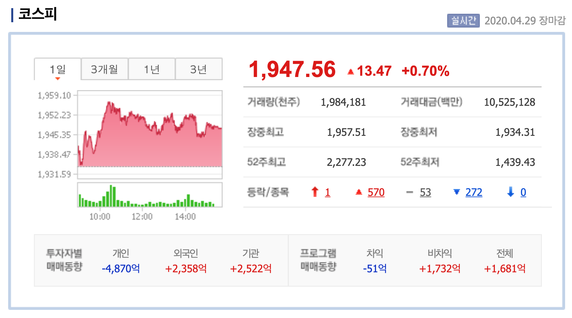 2020년 4월 29일 코스피는 1947.56 포인트를 기록했습니다.