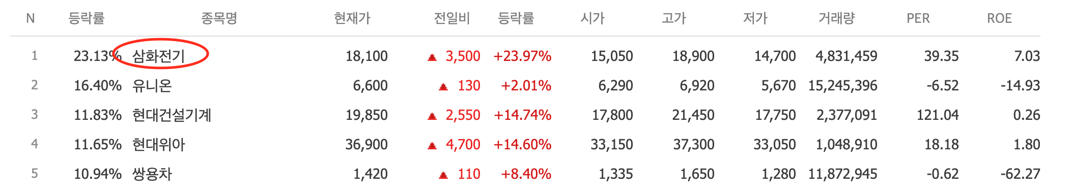 삼화전기는 전일대비 3,500원(23.97%) 상승하여 18,100원에 장을 마감했습니다. 삼화전기와 함께 오늘 급등주를 살펴보고 이야기를 시작해볼까요?