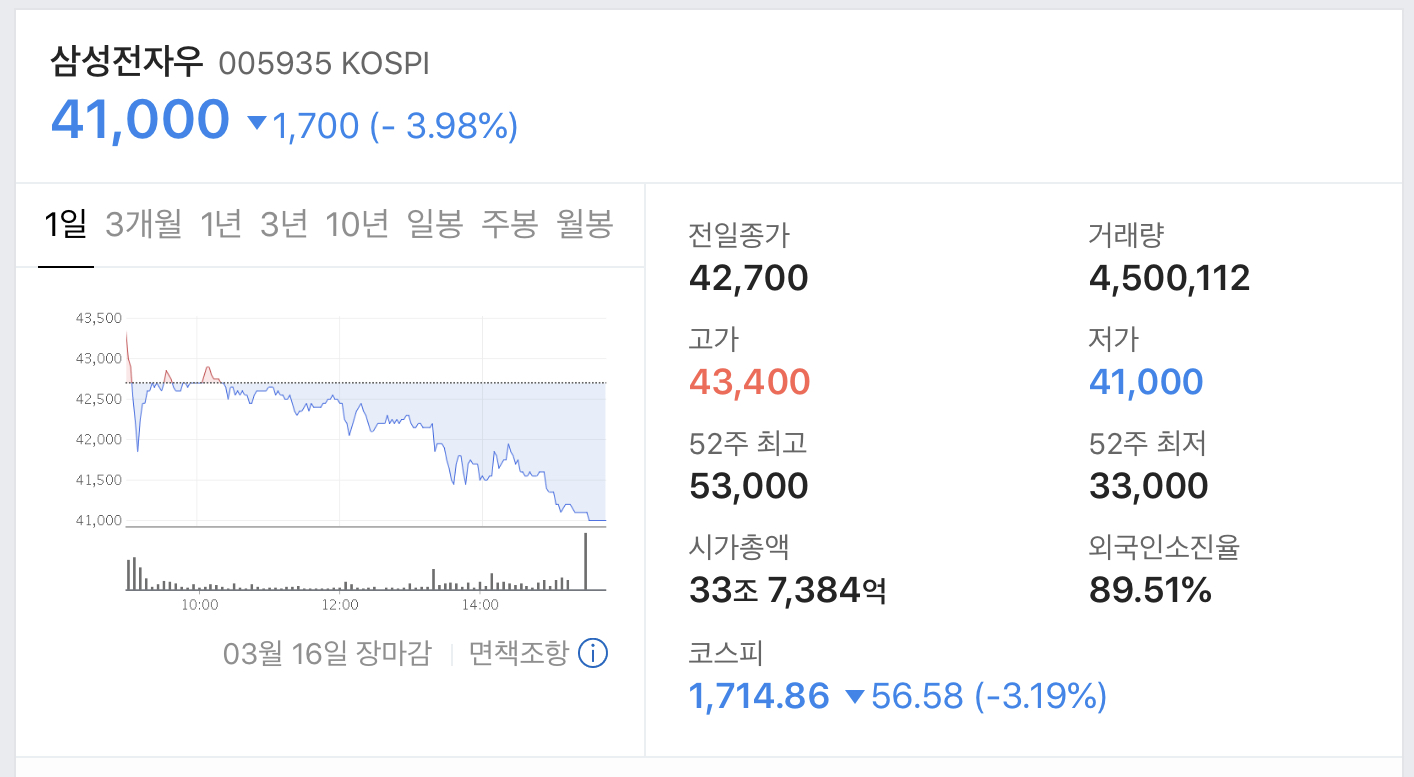 삼성전자와 삼성전자우의 경우 코스피 평균보다 더욱 하락하는 모습을 보여줬습니다.